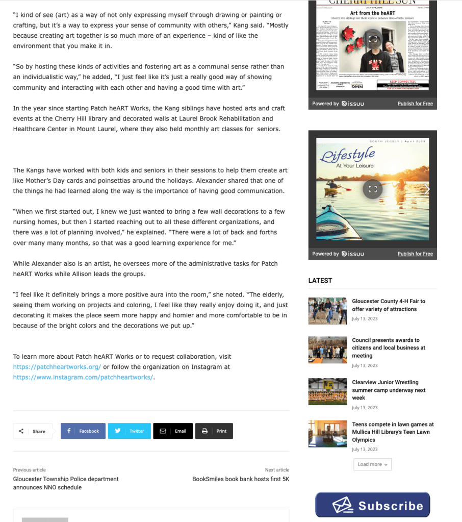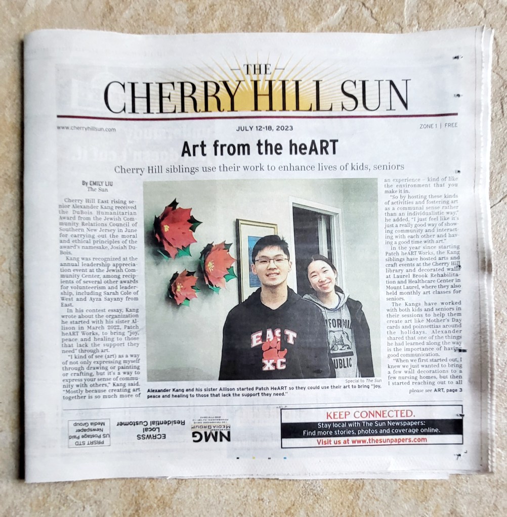 In the year since starting Patch heART Works, the Kang siblings have hosted arts and craft events at the Cherry Hill library and decorated walls at Laurel Brook Rehabilitation and Healthcare Center in Mount Laurel, where they also held monthly art classes for  seniors.