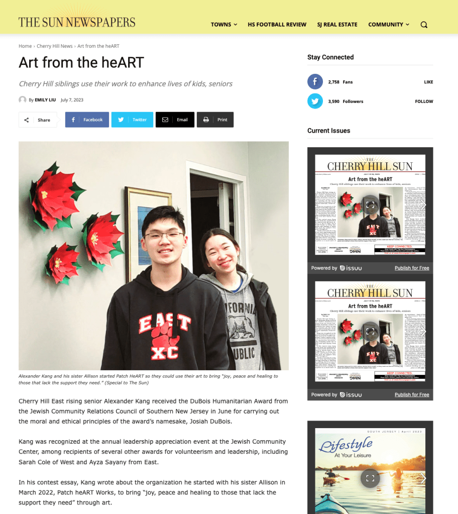 In his contest essay, Kang wrote about the organization he started with his sister Allison in March 2022, Patch heART Works, to bring “joy, peace and healing to those that lack the support they need” through art.